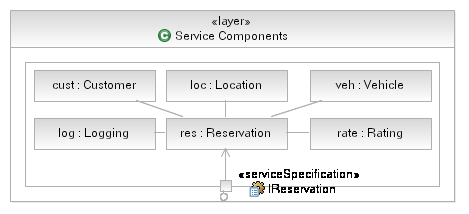 Now, in this layering scheme it is reasonably simple to realize where our components will reside, we place the relevant components for our Rent-a-Car example into the Service Components layer, as shown below. Note that we wish to employ strict layers in our model and so we utilize UML Composition to contain our components in the Service Component layer and only expose the functionality of the Service Components using delegate ports where the port provides the same interface as the Service Component itself.
